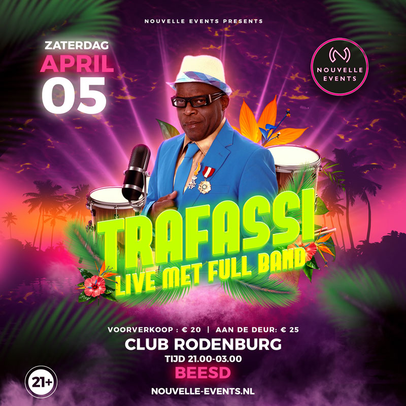 Kom op 5 april naar Club Rodenburg in Beesd en beleef een onvergetelijke avond met Trafassi live. Zorg dat je erbij bent en geniet van de beste Surinaamse feestvibes.